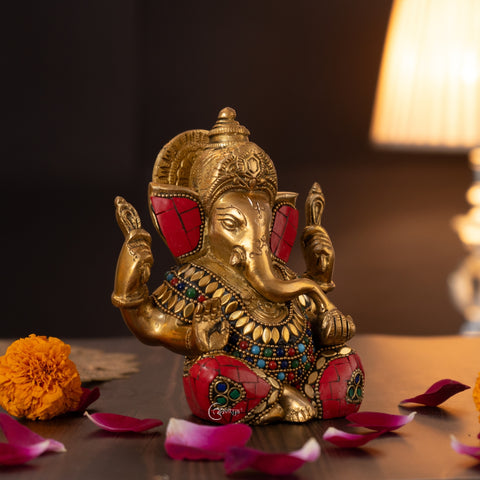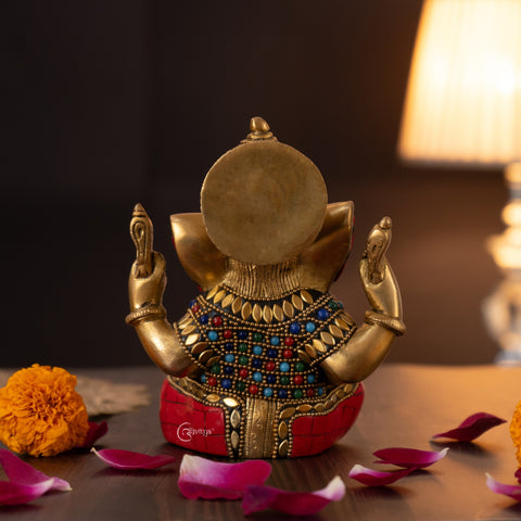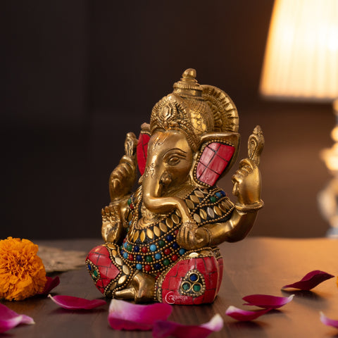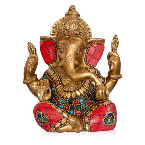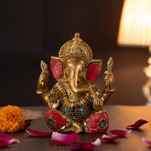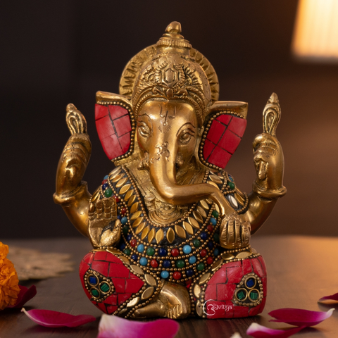 This Stonework Brass Ganesha Idol for Mandir & Home Décor (6.5 Inch) is a fine example of traditional craftsmanship combined with artistic detail. Made from solid brass and weighing 1.4 kg, the idol features delicate stonework accents that enhance its visual appeal. Lord Ganesha is shown in a calm blessing posture, representing wisdom, prosperity, and protection. With compact dimensions of 4.5 inches in length, 3.5 inches in width, and 6.5 inches in height, it fits comfortably in home mandirs, offices, shelves, or spiritual corners. Suitable for daily worship, home décor, and meaningful gifting.